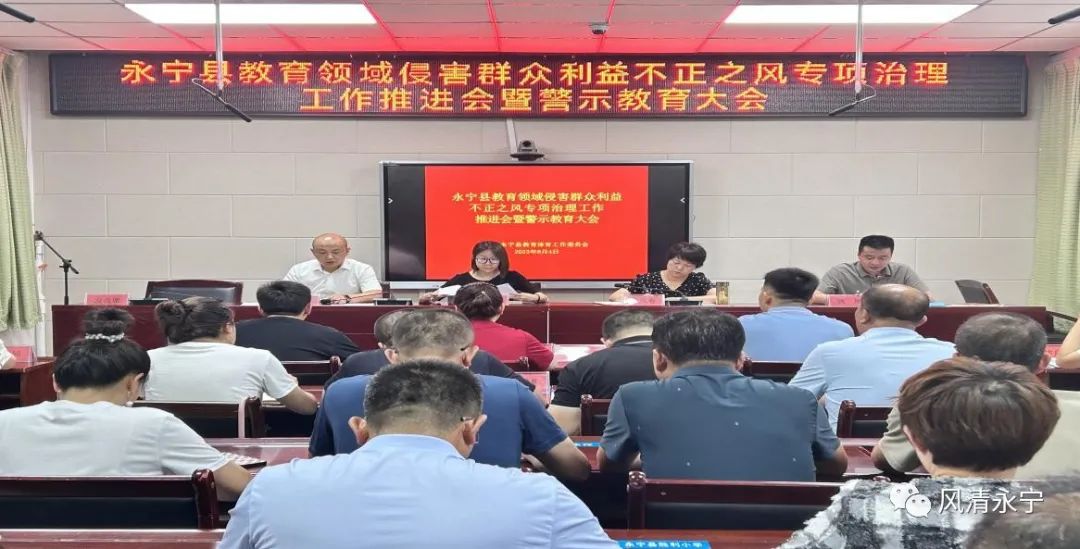 近日,永宁县召开教育领域侵害群众利益不正之风专项治理工作推进会暨警示教育大会,各成员单位、相关派驻纪检监察组组长、专治办成员、各学校书记、校(园)长参加此次会议。县教育领域侵害群众利益不正之风领导小组组长、县纪委副书记、监委副主任邢利斌同志,县教育领域侵害群众利益不正之风领导小组组长、教体局党工委书记、局长吕乐春同志分别对专项治理工作提出要求并作出部署。